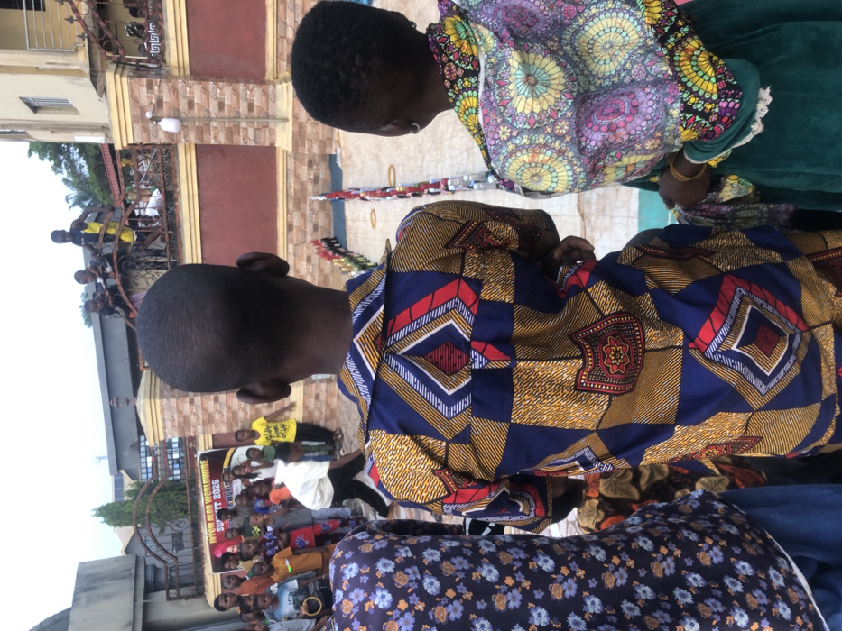 A crowd of people are gathered, partially obscured by two individuals in the foreground. One wears a blue and gold patterned shirt with diamond-shaped motifs. The other has a patterned multi-colored top and green skirt. A sign is visible behind the crowd, suggesting an event or meeting. Additional people can be seen on an elevated balcony, observing the gathering below. The setting appears to be an outdoor courtyard or open space.