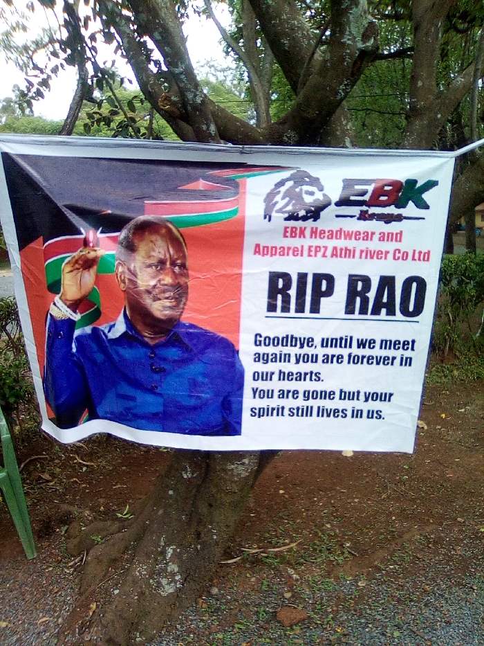 In West Sakwa ward, Kenya, an outdoor scene features a large, horizontally oriented banner secured between trees. The banner displays a memorial message. On the left side of the banner, a photographic portrait shows a mature, balding man with dark skin, wearing a blue long-sleeved collared shirt, depicted from the chest up, facing forward with a slight smile and his right hand raised in a gesture. The background behind the man features segments of the Kenyan national flag's colors (black, red, green). The right side of the banner, against a white background, includes a logo depicting a lion's head above "EBK Kenya," followed by "EBK Headwear and Apparel EPZ Athi river Co Ltd" in smaller red text. Below this, prominent black capitalized text reads "RIP RAO." Further down, a multi-line eulogy states: "Goodbye, until we meet again you are forever in our hearts. You are gone but your spirit still lives in us." The banner is draped across the visible roots and lower trunk of a large tree with gray-brown bark. Above the banner, the tree's branches are covered in green foliage. The ground beneath the banner and tree consists of damp, dark reddish-brown soil mixed with small stones and gravel, with a few green plant sprouts visible. A single green plastic chair leg is partially visible on the far left edge of the frame. The sky is overcast, providing diffused natural lighting. The banner shows minor creases and folds.
