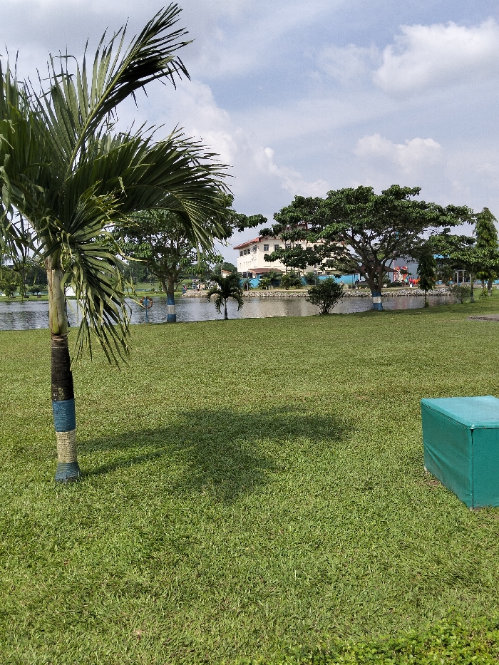 The image depicts an outdoor landscape in Rumuomasi, Nigeria, under a partly cloudy sky. The foreground is a manicured expanse of green grass. A palm tree is positioned on the left, its lower trunk banded with black, blue, and beige colors, casting a shadow to its right. On the far right, a rectangular object covered in dark green material rests on the grass. In the midground, a calm body of water is visible, extending horizontally. The opposite bank features several trees, some with their trunks painted in blue and white stripes. A white lifebuoy on a stand is discernible near the water's edge on the far bank. Small, indistinct figures appear on the distant bank across the water. The background is dominated by a light-colored, multi-story building with a reddish-brown roof, partially obscured by the dense green foliage of large trees. Other structures with blue architectural accents are also present. The sky above is light blue with scattered white cumulus clouds.
