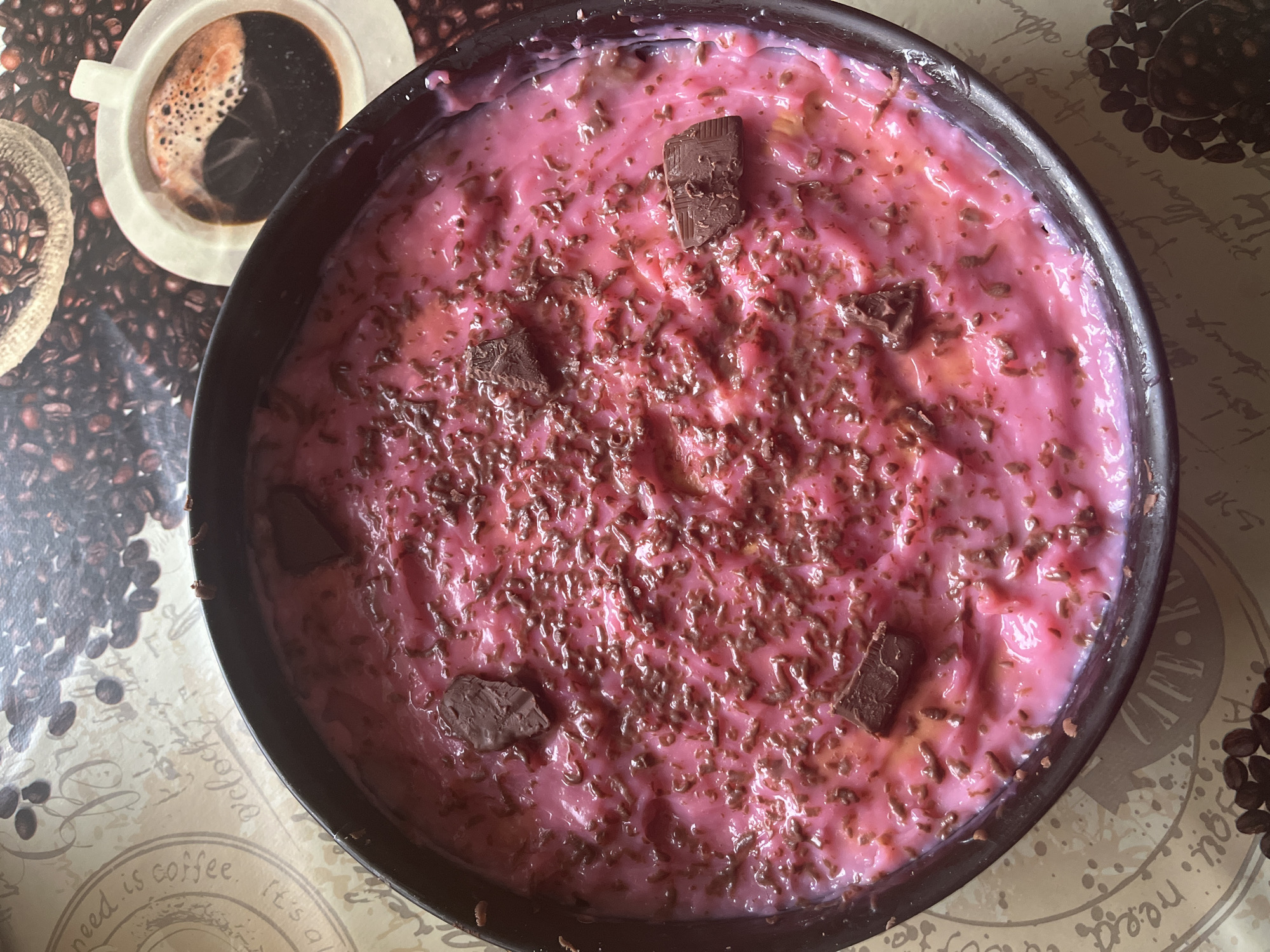 - "A dark-colored, circular baking pan, approximately 20-25 cm in diameter, contains a pink, creamy dessert" by FM-JfVfu2, licensed under CC BY 4.0