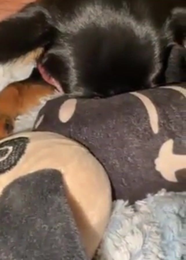 A dog is asleep on a blue blanket. The dog is small, with black fur on its head and back, tan fur on its legs and chest, and floppy ears. The dog is lying on its side with its head resting on a grey pillow with a pattern of white, abstract shapes that appear to be stylized bones. To the left of the grey pillow is a beige and black stuffed animal toy, part of which is visible in the frame. The blanket is soft and fluffy. The dog is sleeping soundly.