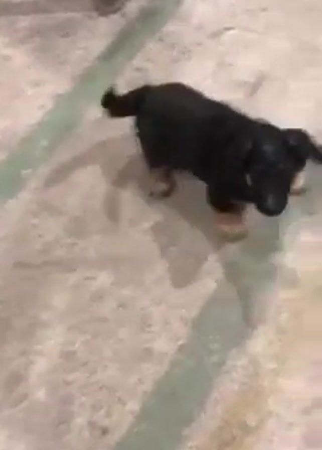 A black and tan puppy walks on a concrete surface. The puppy has short legs and a long body. The concrete is stained and has painted green and yellow lines. The puppy trots around a wooden pallet on the left side of the frame. The puppy is facing toward the camera.