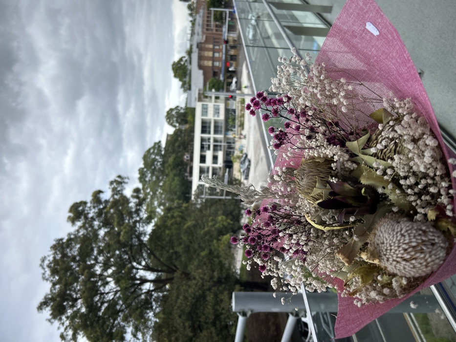A bouquet wrapped in pink paper features dried flowers in shades of white, purple, and brown. Textures vary from fluffy to spiky. The backdrop reveals a cloudy sky over trees and buildings. The image is taken from a high vantage point, possibly a balcony, with glass railings visible. The flowers appear to be in focus, contrasting with the somewhat blurred background.