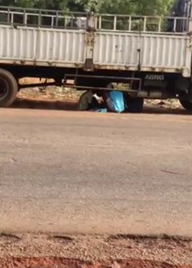 two people kneeling down under the body of a large white truck on the side of a road. The person on the left is wearing a striped shirt and baseball cap. The person on the right is wearing a light blue sleeveless shirt and light-colored shorts, with a baseball cap. Their backs are to the camera, and they appear to be working on something placed between them on the ground. There are bags and items on the ground near them. The road is asphalt, and the surrounding area has reddish soil and green trees.