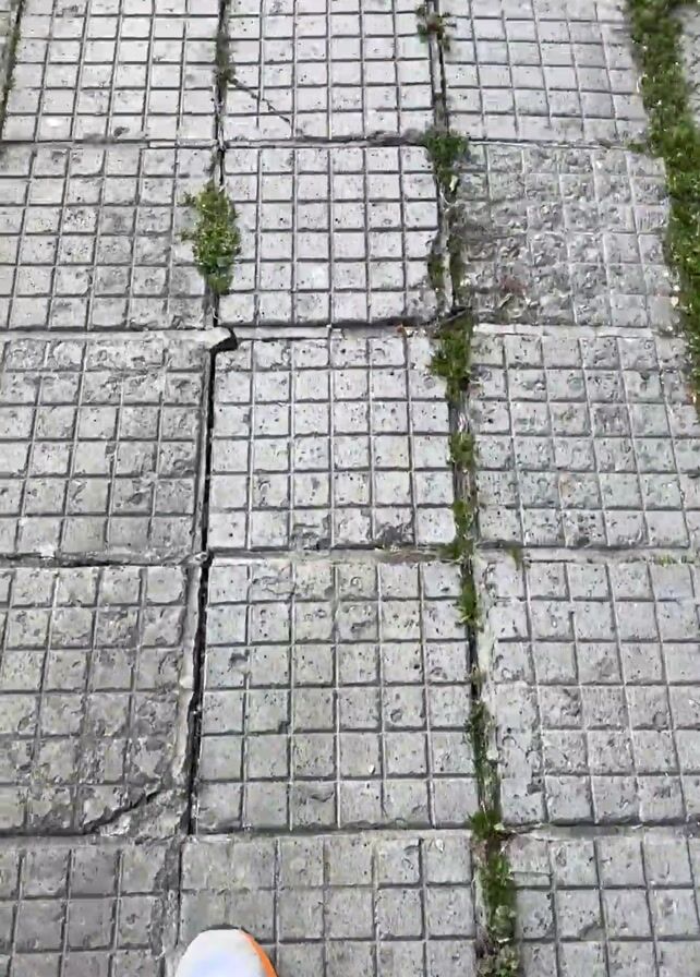 The video depicts a person walking along a cracked, tiled pathway outdoors