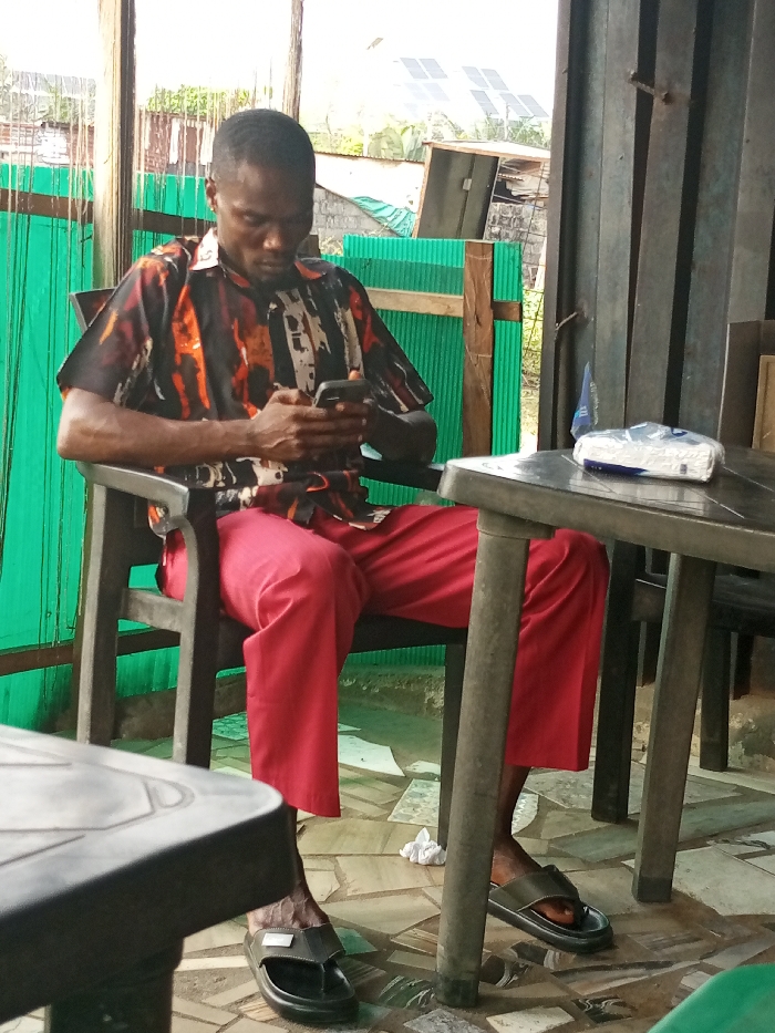 A man sits in a black plastic chair, absorbed in his phone. He wears a patterned short-sleeved shirt and bright red pants. Black sandals adorn his feet. He's positioned at a table, with a packet of tissues resting on its surface. The background reveals glimpses of corrugated metal fencing, foliage, and a structure with solar panels. The scene appears to be outdoors or in a semi-enclosed space.