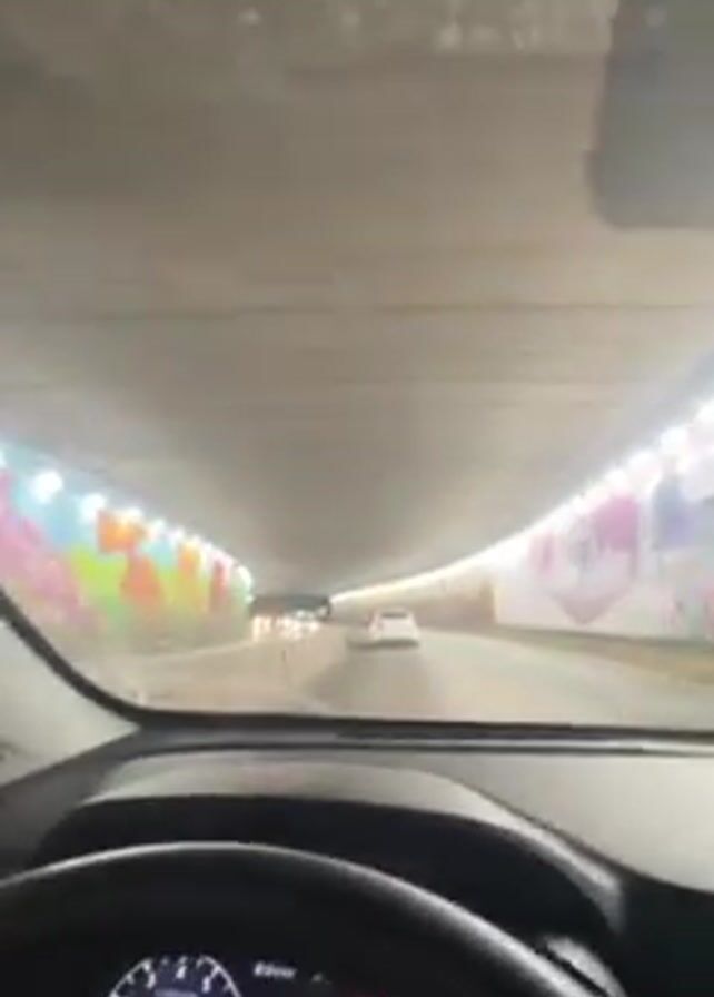 A car is driving through a tunnel with graffiti art on the walls. There are other cars in front of the car taking the video. The dashboard of the car is visible, showing that the car is in drive and the time is 8:51 PM. The tunnel is well-lit. The windshield of the car is slightly dirty.