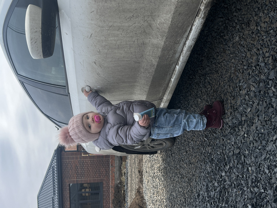 A young child stands outdoors in the city of Leninakan, Russia. The child, appearing to be a toddler, wears a light pink knitted hat with a large pompom, a gray puffer jacket, light blue jeans, and burgundy boots. A pink pacifier is inserted into the child's mouth. The child holds a light blue and white tube in the left hand and grips the passenger-side door handle of a dirty white vehicle with the right hand. The vehicle's lower body panels and exterior mirror are heavily streaked with mud and dirt. The ground is covered with dark gray crushed stone. In the background, a section of a brick building with a dark roof and a window is visible to the left, adjacent to a pile of dark earth. The sky above is overcast.