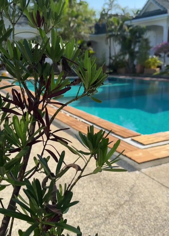 swimming pool on a sunny day. The pool is surrounded by a wooden deck and concrete. Green foliage is visible in the foreground and a white building is visible in the background, surrounded by palm trees and other greenery. The water in the pool is a vibrant turquoise color. There is no sign of people or animals. The camera pans slowly, revealing the pool and its surroundings.