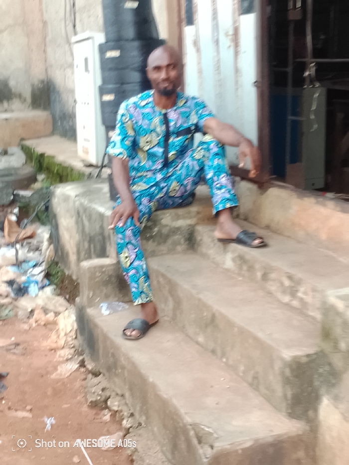 This image, captured in Onitsha, Nigeria, depicts an adult male seated on a set of concrete steps in an outdoor setting