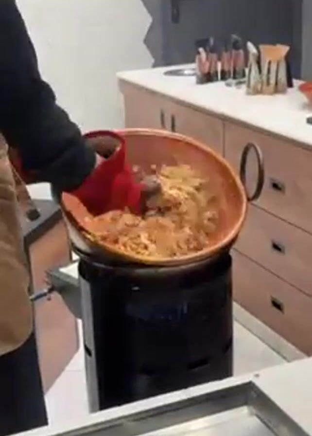 A person wearing a tan apron, black sweater, red oven mitts, and a cap stirs contents within a large copper pot over a small gas stove, creating steam