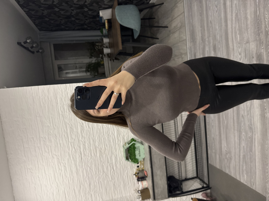 A female individual is depicted taking a mirror selfie in an interior domestic setting within the city of Stary Oskol, Russia. The subject, with long brown hair, is wearing a close-fitting, long-sleeved, brown turtleneck top and black leggings. She holds a dark-colored smartphone in her left hand, aimed towards the mirror, with a silver-colored ring visible on her left ring finger. Her right hand rests on her hip. The floor is light grey, wood-patterned. To the left, a white textured wall resembling decorative brick paneling is visible. Beneath this wall, a dark grey console table with multiple shelves holds various small items, including a hexagonal container with green moss. The reflection in the mirror reveals a room with a dark patterned wall, a window displaying potted plants, a wooden dining table, and a single light blue chair. Overhead, a ceiling light fixture with multiple bulbs is present.