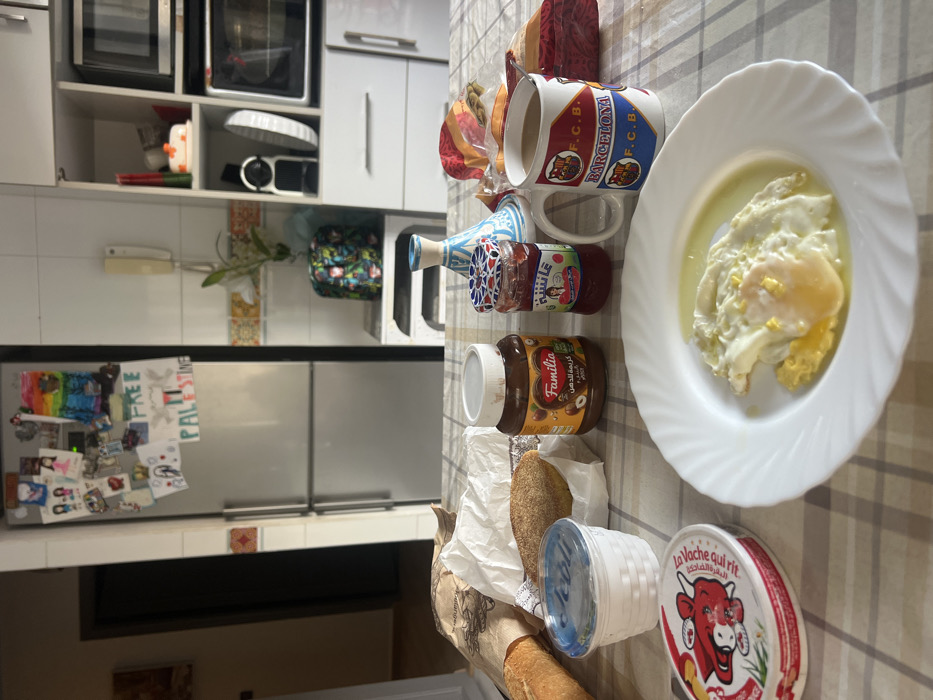 A table laden with breakfast items sits against a kitchen backdrop featuring white cabinets and a refrigerator adorned with artwork and a "Free Palestine" sign. The meal consists of a fried egg on a white plate, a FC Barcelona mug, and a jar of jelly. Nutella, a baguette, a plastic tub of spread, and a round container of La Vache qui rit cheese also populate the table. The background implies a domestic setting.
