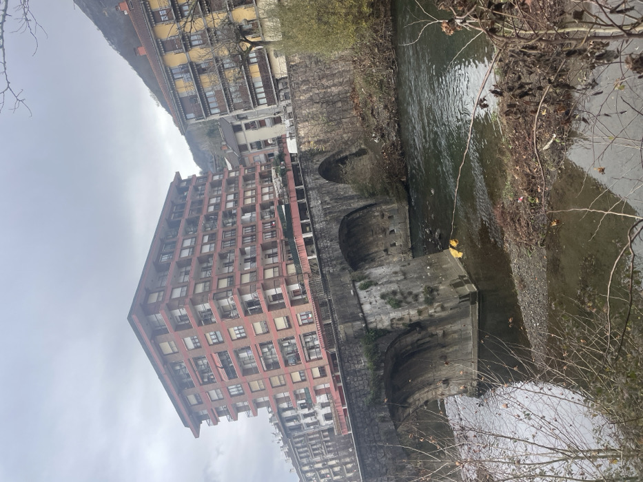 The image captures a riverfront scene in Azpeitia, Spain, under an overcast sky