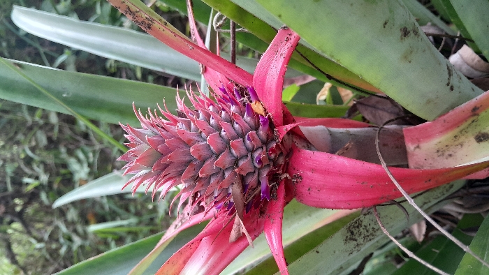 - "A vertical, close-up image depicts a developing pineapple (Ananas comosus) inflorescence situated in Lhokseumawe, Indonesia" by FM-hcL462, licensed under CC BY 4.0