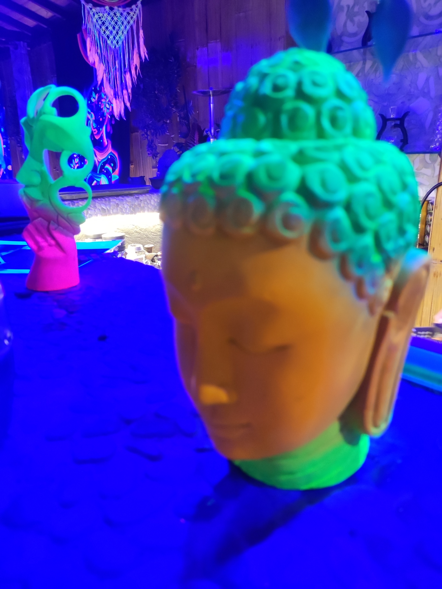 The image displays an interior scene illuminated by ultraviolet (UV) light, creating a predominant blue and neon color palette, located in Lokaserena, Indonesia. In the foreground, two sculptures are positioned on a dark, reflective surface. On the right, a Buddha head sculpture is visible, rendered with a matte orange-yellow face and a glowing neon green topknot (ushnisha) and neck, indicative of UV-reactive material. The eyes are depicted as closed. To the left, a second, abstract sculpture stands. This piece is primarily neon green with a vibrant pink base, both glowing under the UV light. It features circular cutouts within its elongated form. The background contains several decorative elements. Centrally, an intricate macrame wall hanging with feathered accents glows bright pink and purple. Below it, a large mural depicts a stylized female face with floral patterns, rendered in neon pink, blue, green, and yellow against a dark backdrop. To the right of the mural, a low, textured wall or counter is illuminated from below, emitting a warm white glow. Further right, a glass shelf unit holds dark, indistinct objects. Vertical wooden planks are visible in parts of the background architecture. No individuals are present in the frame.