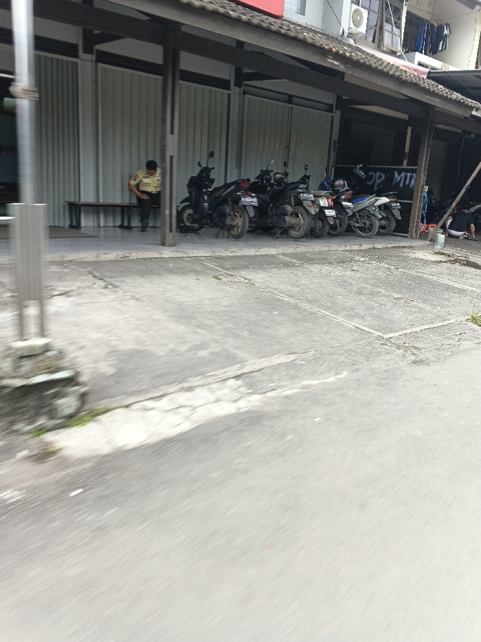 An outdoor scene in Cangkuang Kulon, Indonesia, depicts a section of a concrete street and an adjacent commercial building. The street surface is grey and exhibits cracks. In the foreground on the left, an out-of-focus grey square-sectioned pole with a concrete base rises. The building features a dark, sloped tiled roof supported by dark columns, creating an overhang. Under this overhang, a light-skinned male individual, dressed in a light tan or yellow polo shirt and dark trousers, is seated on a long wooden bench to the left. He is leaning forward, looking down or adjusting something in his lap or at his feet. Directly to the right of this individual, under the same overhang, approximately seven motorbikes or scooters, mostly dark-colored, are parked in a row facing forward. Further to the right, a darker recessed area, possibly a shop entrance, displays partial white graffiti or signage reading "OP MTR". Another individual, wearing a dark shirt and light-colored shorts or pants, is seen squatting or bending low near a white bucket within this darker area. Above the building's ground level, an air conditioning unit is mounted, and dark laundry is hanging from an upper window or balcony. The background behind the seated individual consists of light-colored vertical panels or blinds.