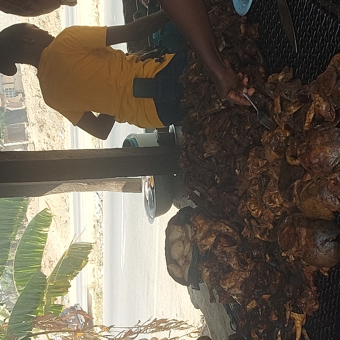 The image depicts a roadside food stall operating during daylight in Assai Sabongida, Nigeria