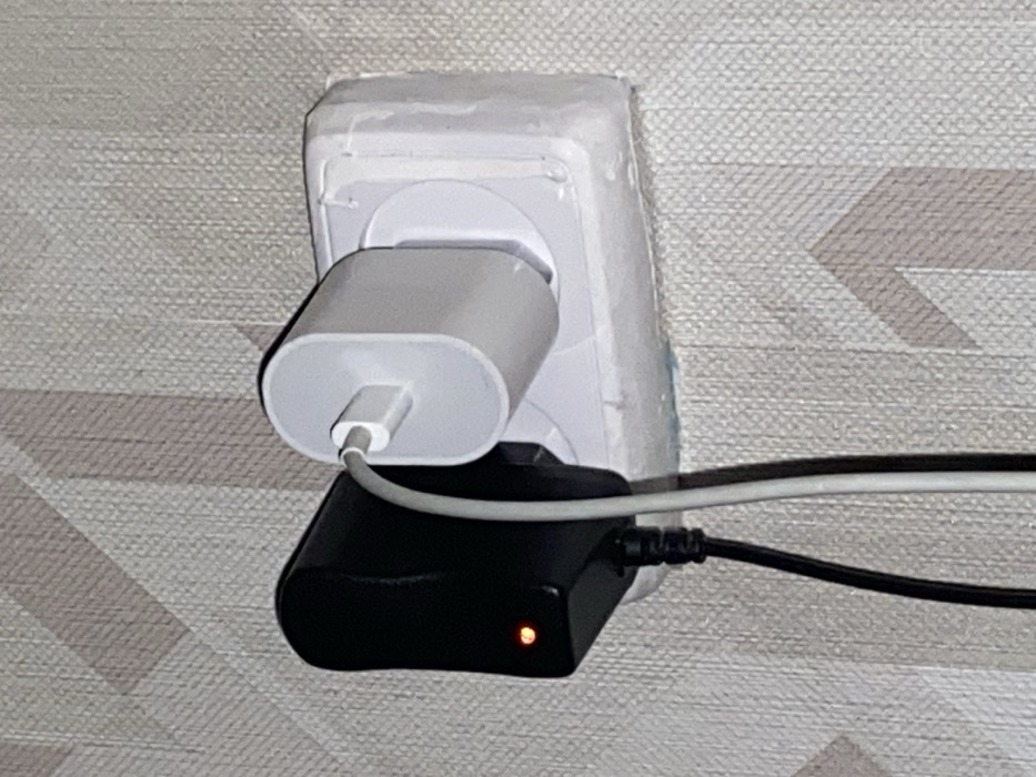 A white, European-style wall socket is occupied by two charging adapters. The top adapter is white and rectangular, with a gray charging cable plugged into its bottom. Below it, a black adapter with a red LED is also plugged into the same socket, and two black charging cables are connected to its side. The wall behind the socket has a gray and white patterned wallpaper.