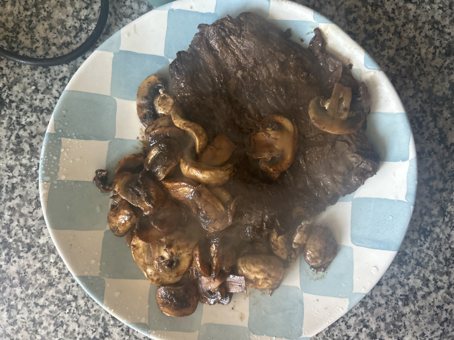 A square-cut steak sits atop a blue and white checkered plate. The steak is a dark brown color with visible grill marks. Cooked mushrooms, glistening with oil, are piled on the side and partially cover the steak. Steam rises from the food, indicating it is freshly cooked. The plate is placed on a speckled gray countertop.