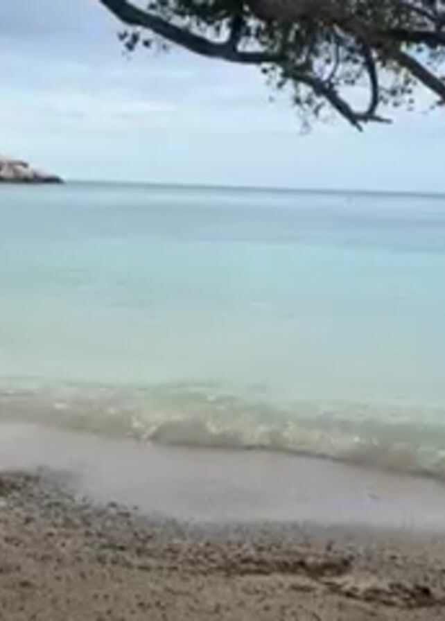 The camera shows a beach with calm turquoise water. Gentle waves lap the shore, which has dark sand. A rocky outcrop covered in greenery is on the left. Branches of a tree are visible at the top of the frame, partially obscuring the sky. The sky is overcast. There are people swimming in the distance.
