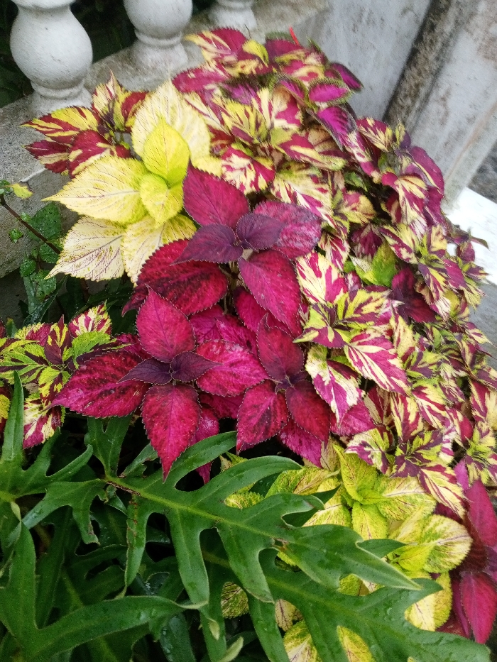 The scene is located in Khe Sanh Commune, Vietnam. The image depicts a dense arrangement of foliage plants, primarily Coleus, featuring various colors and patterns. Visible are Coleus plants with solid deep magenta and purplish-red leaves, as well as variegated types displaying bright yellow, lime green, and burgundy red mottling. Several leaves show visible water droplets. In the lower portion of the frame, a large, deeply lobed dark green leaf, consistent with a species of Philodendron, is present. The background reveals light-colored, possibly concrete or stone, architectural balusters in the upper left, and a darker, textured structural element or wall extending from the upper right. No individuals or animate subjects are present, and no actions or interactions are depicted.
