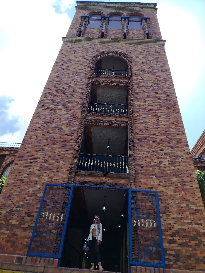 A tall, multi-story brick building in Carrizal, Venezuela, is depicted under daylight conditions. The structure features variegated reddish-brown and brown brickwork. Its upper portion contains three arched window openings accented with blue framing and vertical slat structures. Below these, three distinct recessed levels are visible, each equipped with a dark metal balcony railing adorned with blue and white/gold diamond patterns. Hanging light fixtures are present within these recessed areas. At the lowest visible level, a wide entrance is framed by blue metal gates, which also feature diamond-patterned grilles. A single female subject stands centrally at this entrance. She wears sunglasses, a light-colored jacket, dark trousers, and light-colored boots. She holds a dark motorcycle helmet, featuring a red accent, in her left hand. The sky above is partially cloudy.
