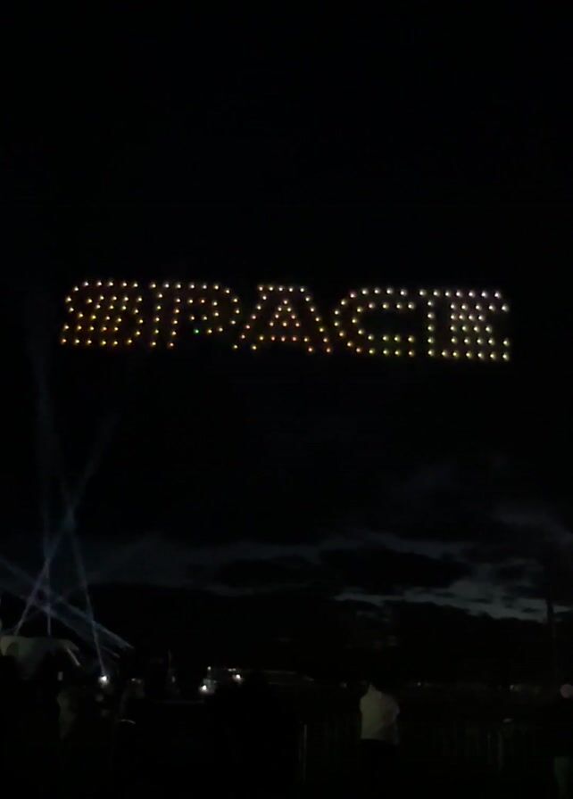 nighttime event with a drone display spelling out "MIRACLE" in the sky