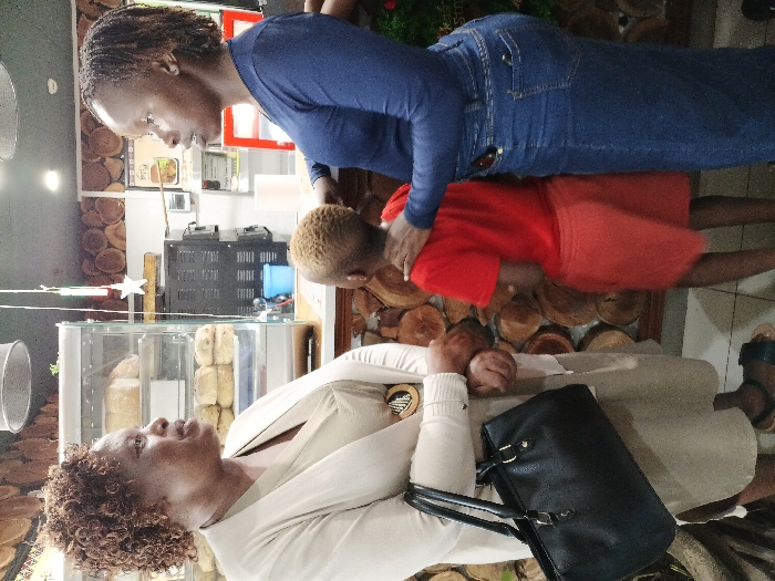 This image depicts an indoor scene within a commercial establishment, likely a bakery or cafe, situated in Harare, Zimbabwe. Three individuals are present: two adult women and one child. On the left, an adult woman with curly brown hair wears a light-colored cardigan over a beige dress and carries a black handbag on her left arm. She is positioned facing right, appearing to be in conversation. Her hands are clasped at waist level. On the right, another adult woman with dark, short dreadlocks or braids wears a dark blue long-sleeved top and dark blue denim trousers. She is positioned facing left, engaging with the first woman. Her right hand rests on the shoulder of the child in front of her. Between the two women, partially obscured and seen from the back, is a child with short, light-colored hair, wearing a red t-shirt and red shorts. The child is looking towards the left. In the background, a glass display case showcases baked goods, including loaves of bread and buns. A counter behind the women features a black appliance, a blue container, and a white paper roll. The wall is decorated with numerous circular wooden log slices. Overhead, a light fixture and green, red, and white Christmas-themed ornaments, including a star, are visible. The floor is tiled. The overall interaction suggests a casual discussion among the individuals within the commercial setting.