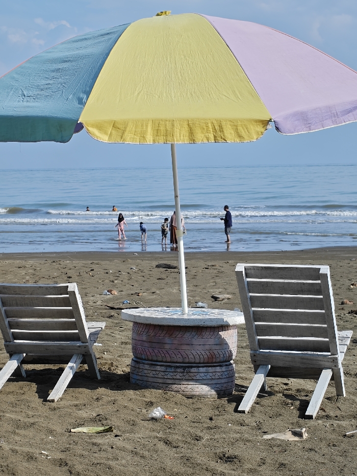 This image depicts a beach scene in Reudeuep, Indonesia, under a clear blue sky. In the immediate foreground, dark sand covers the ground, showing scattered debris including a green leaf and a clear plastic bag. A large, multi-colored beach umbrella with sections of light blue, yellow, and light purple stands centrally, supported by a white pole. Beneath the umbrella, a round table made from two stacked, painted tires with a light-colored, textured top is positioned. Flanking the table, two light-colored, slatted wooden beach chairs face towards the sea, with their backs to the viewer. At the water's edge in the midground, several individuals are present. On the left, a person wearing light-colored clothing and a head covering wades in the shallow water, facing right, near a smaller individual in blue. To their right, another group of individuals, including at least one adult and one child, are also wading. Further to the right, a person in dark clothing and a dark head covering stands facing the water, holding a rectangular object. Gentle waves break along the shoreline. In the background, the calm, blue ocean extends to the horizon, where two additional figures are partially submerged, appearing to be swimming or floating. The sky above is clear and light blue.