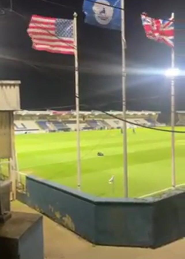 The video depicts a brightly lit soccer stadium at night. Three flags are displayed on poles: the American flag, a blue flag with a white emblem in the center, and the British Union Jack. Several people in dark clothing can be seen walking onto the field. A security guard is standing near a gate to the field. The stadium seating is visible in the background. The camera appears to be positioned outside of the stadium, looking down towards the field. The area near the camera includes a low, painted wall and some steps. There are also some wires visible against the night sky.