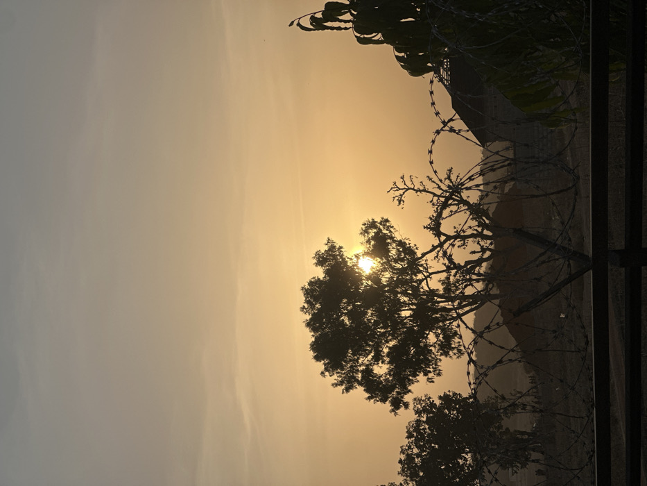An image taken facing the sun, which is peeking through the branches of a silhouetted tree. Barbed wire is strung across the top and right side of the image, creating a visual barrier. The sky is a hazy mix of yellow and gray, suggesting either sunrise or sunset. Vegetation can be seen in the foreground. The image is rotated to the right.