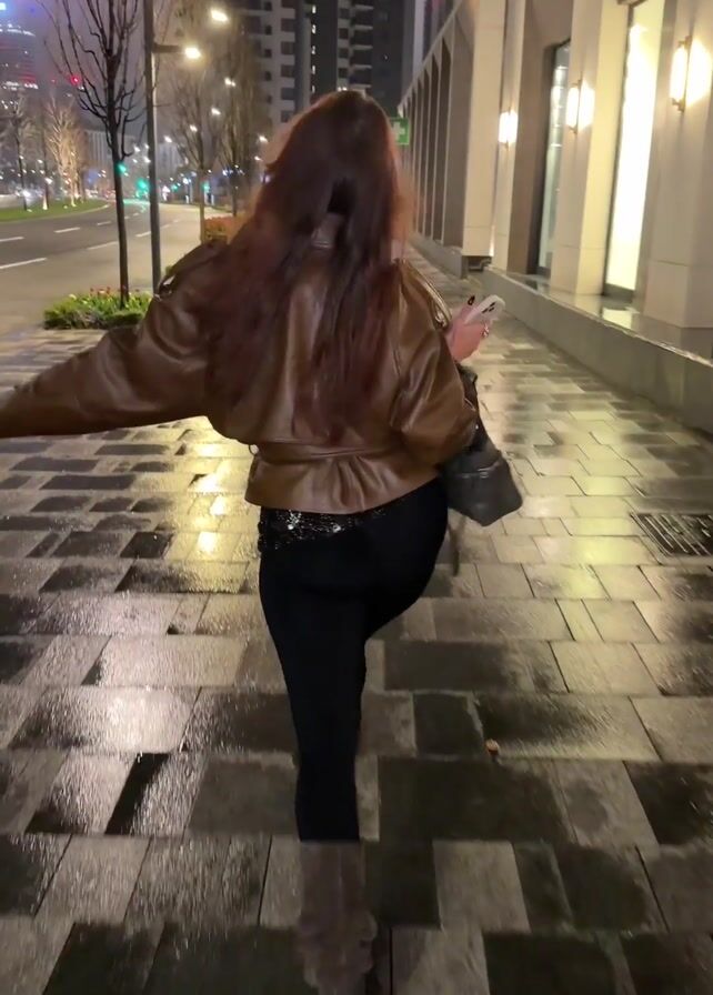 A woman with long brown hair is seen from behind, walking away from the camera on a wet, tiled sidewalk. She is wearing a brown leather jacket, black pants, and brown boots. She is carrying a gray bag over her shoulder. The sidewalk is bordered by a street with trees and buildings in the background. Streetlights illuminate the scene. The weather appears to be rainy. The woman occasionally swings her arms as she walks.