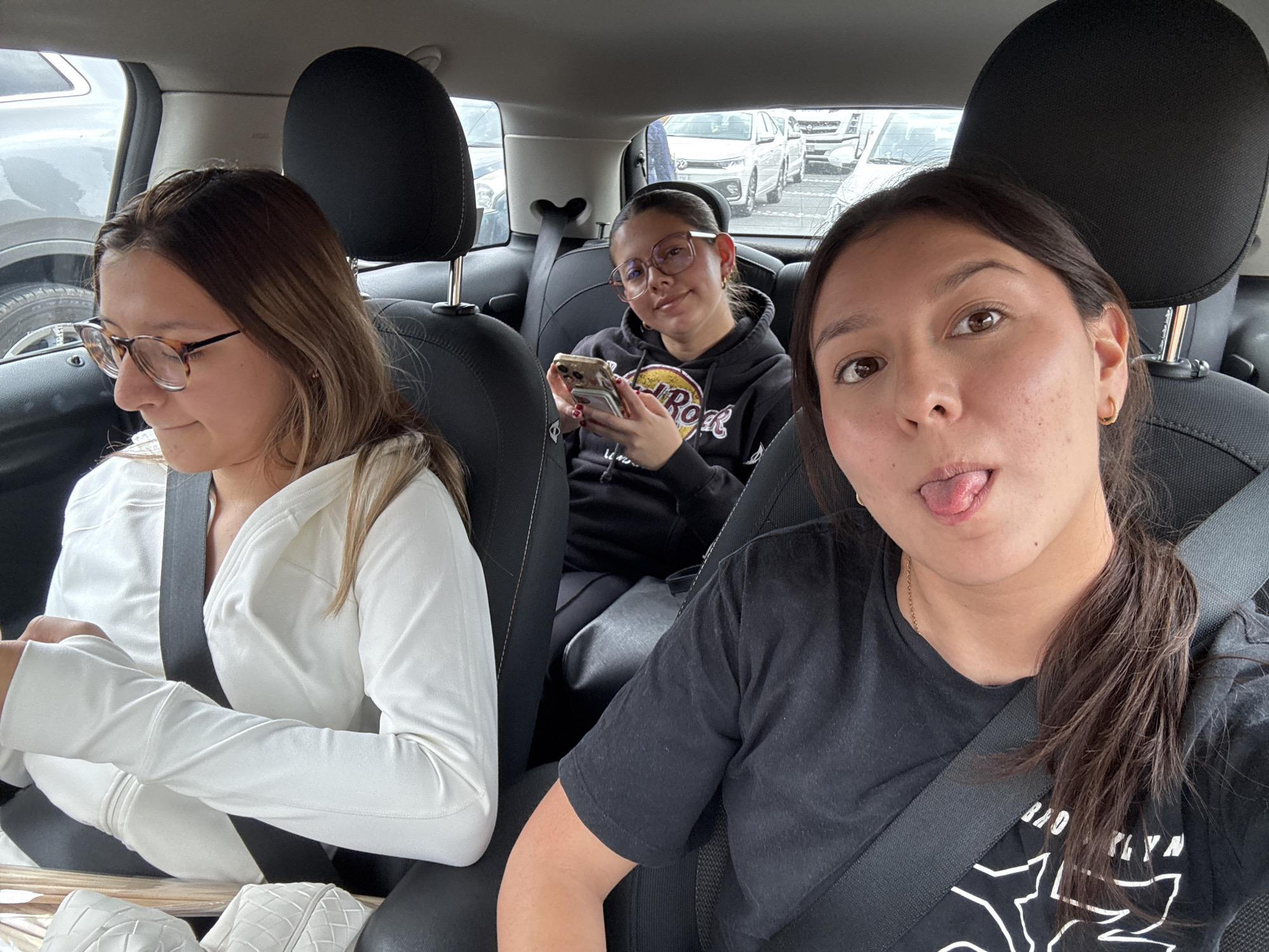 The image captures three young women seated inside a car, located in Barrio de Nuevo León, Mexico. In the foreground, a woman with dark brown hair in a ponytail wears a black short-sleeved t-shirt with white graphics and a black seatbelt. She looks directly towards the viewer with her tongue slightly extended. To her left, in the middle ground, another woman with light brown hair and tortoiseshell glasses is seen wearing a white long-sleeved top and a black seatbelt, looking downwards. In the back seat, behind the foreground woman, a third woman with dark hair and round glasses wears a black hoodie with a yellow and red logo and a black seatbelt. She holds a smartphone with a light-colored, textured case in both hands, displaying red nail polish, and looks towards the camera with a slight smile. The car's interior features dark-colored seats and headrests. Through the vehicle windows, a parking lot is visible, containing several white passenger vehicles and one grey vehicle, under what appears to be an overcast sky.