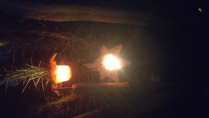 - "Two cactus segments, adorned with spiky thorns, hold star-shaped metal lanterns with glowing lights" by FM-0J88a2, licensed under CC BY 4.0