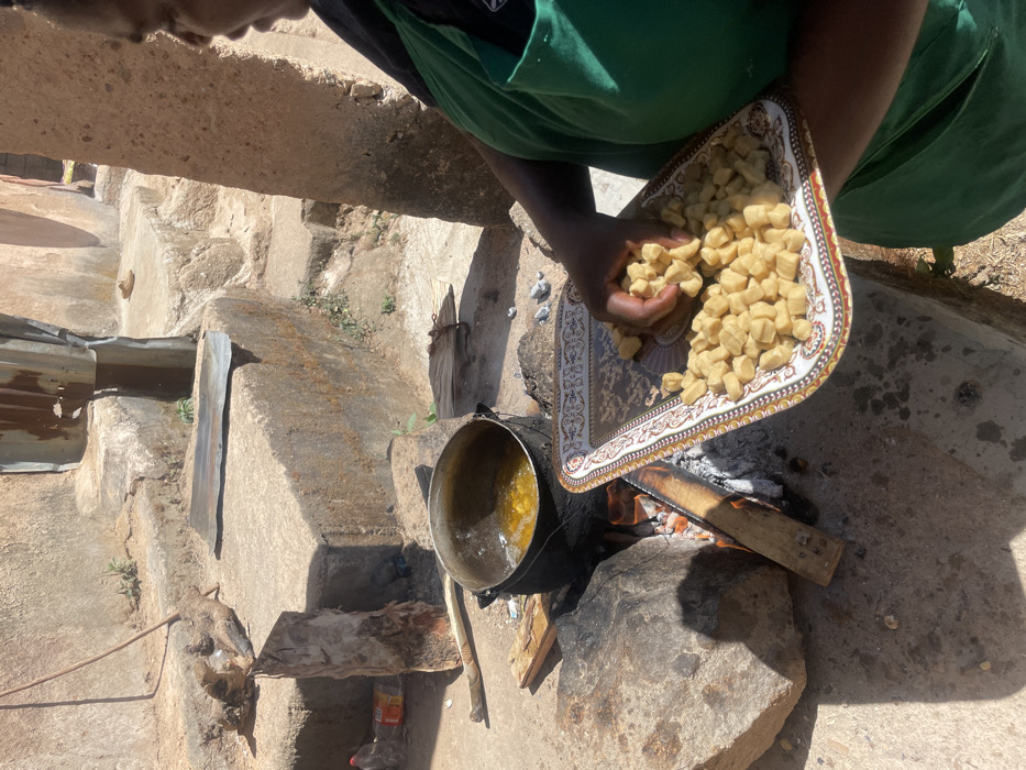The scene depicts an outdoor cooking area in a residential or semi-urban setting, consistent with typical housing environments found in Jos, Plateau State, Nigeria. A person, partially visible on the right, wearing a green apron over a dark top, holds a rectangular white tray with decorative gold and red patterns. The tray contains numerous small, irregularly shaped, light-beige dough pieces, approximately 2-3 cm in length. The individual's right hand is positioned over these pieces, indicating an action of handling or preparing them for cooking. To the left of the individual, an open wood fire burns on the ground, fueled by planks of wood and supported by two large, irregular rocks. A black, round metal pot with handles rests directly over the flames, containing a yellow, bubbling liquid indicative of hot cooking oil. Several light-colored objects, consistent with dough pieces being fried, are visible within the oil. The ground is uneven, composed of packed dirt and small stones. In the background, rough concrete or mud-plastered structures are visible, including a series of ascending steps. Scattered objects in the environment include a clear plastic bottle and a piece of corrugated metal resting on a step. The scene is illuminated by direct sunlight, casting distinct shadows.
