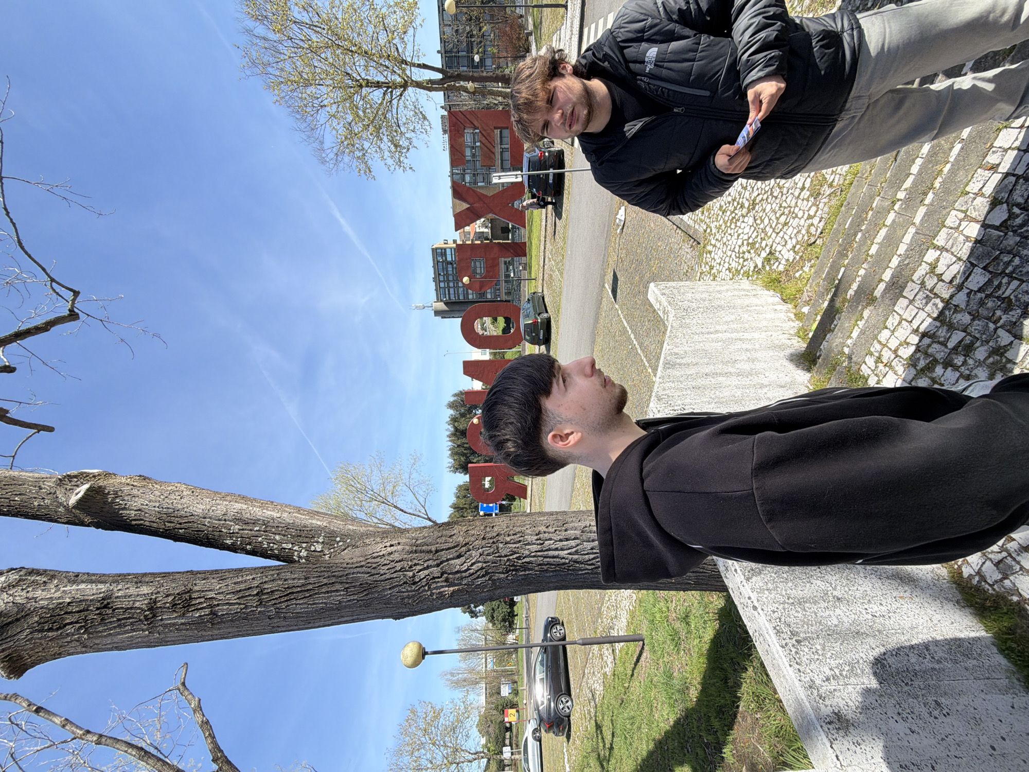 This image depicts an outdoor scene in Matosinhos, Portugal, specifically near the EXPONOR exhibition center, identifiable by the large red "EXPONOR" letters visible in the background. The sky is clear and blue with faint contrails. In the left foreground, a young male, seen in profile, has dark hair with a faded undercut and wears a black hooded sweatshirt. He is positioned next to a large tree trunk, which splits vertically. The tree has rough bark and is mostly bare of leaves, though some trees in the background show nascent foliage. Below him is a light-colored concrete retaining wall or steps. In the right midground, a second young male with light brown, shaggy hair stands on a cobblestone-paved area that includes steps. He wears a black North Face puffer jacket and light-colored pants. He holds several small, colorful rectangular items, possibly cards, in his left hand. The midground features a grassy area with a black street lamp. A paved road runs behind this area, where multiple cars are parked, including a dark grey SUV, a silver sedan, and a dark green Volkswagen Golf. The background is dominated by large, three-dimensional red block letters spelling a portion of "EXPONOR". Behind these letters are several multi-story buildings with numerous windows, and additional trees.