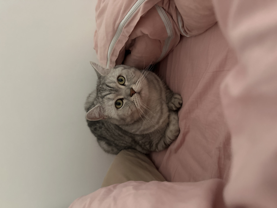 This image displays a domestic cat situated on a bed within a residence in Be’er-Sheva, Israel. The cat, a silver tabby, is positioned centrally, facing directly forward with its paws tucked beneath its body in a "loaf" posture. It exhibits light grey fur with distinctive darker grey tabby stripes. The cat's eyes are large, round, and yellow-green, with constricted pupils. A small, pinkish-brown nose and prominent white whiskers are visible. Its ears are upright and pointed. The cat rests on light pink bedding, which appears slightly wrinkled. To the left of the cat, a section of a beige pillow is visible underneath the pink sheet. To the right, a rumpled pink duvet or comforter with a white zipper and white trim is present. The background consists of a plain, light-colored wall. The scene is evenly illuminated, consistent with indoor lighting.