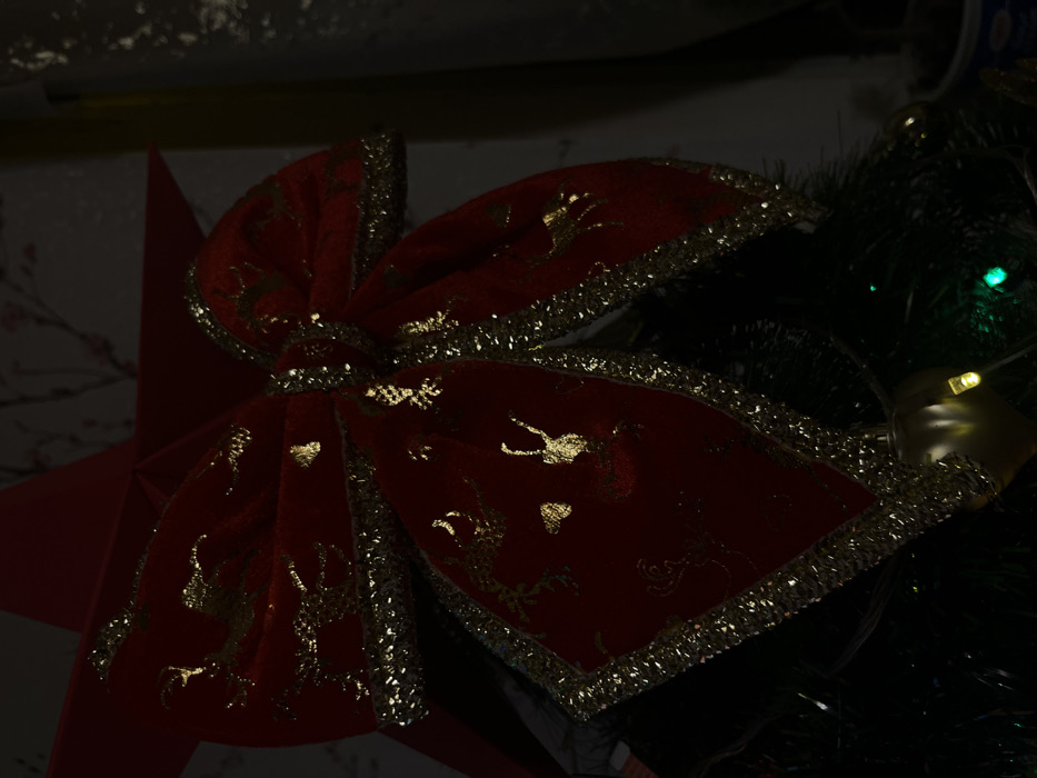 A close-up shows a red bow with gold accents adorning what appears to be a Christmas tree. The bow, featuring a gold trim and decorative reindeer patterns, sits atop a red star. Green pine needles and small, warm-toned Christmas lights are visible on the right. The scene is dimly lit, casting shadows on the decorations and creating a festive atmosphere.