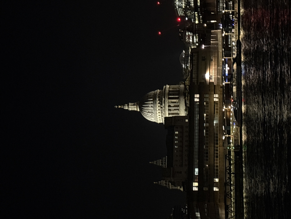 St Paul's Cathedral stands illuminated against a dark night sky. Buildings line the edge of a body of water, their lights reflecting on the surface. The cathedral's iconic dome is clearly visible. Other structures and skyscrapers, also lit up, create a contrasting skyline. A few red lights punctuate the scene.