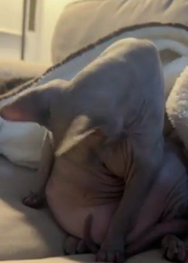 A hairless cat sits on a couch under blankets and grooms itself, twisting to clean its body