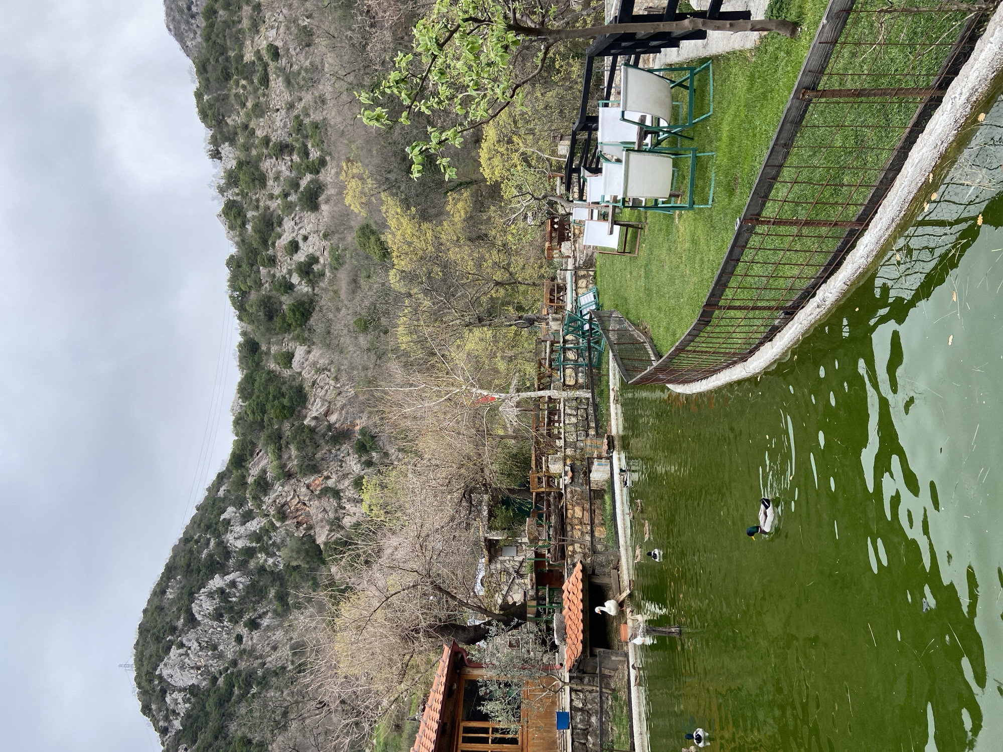 green pond with ducks swimming in it. Along the edge of the pond is a fence and a grassy area with tables and chairs. Behind the pond, there is a small building, trees, and a rocky mountain. The sky is overcast. This scene does not appear to be located in the city of Krapina, Montenegro.