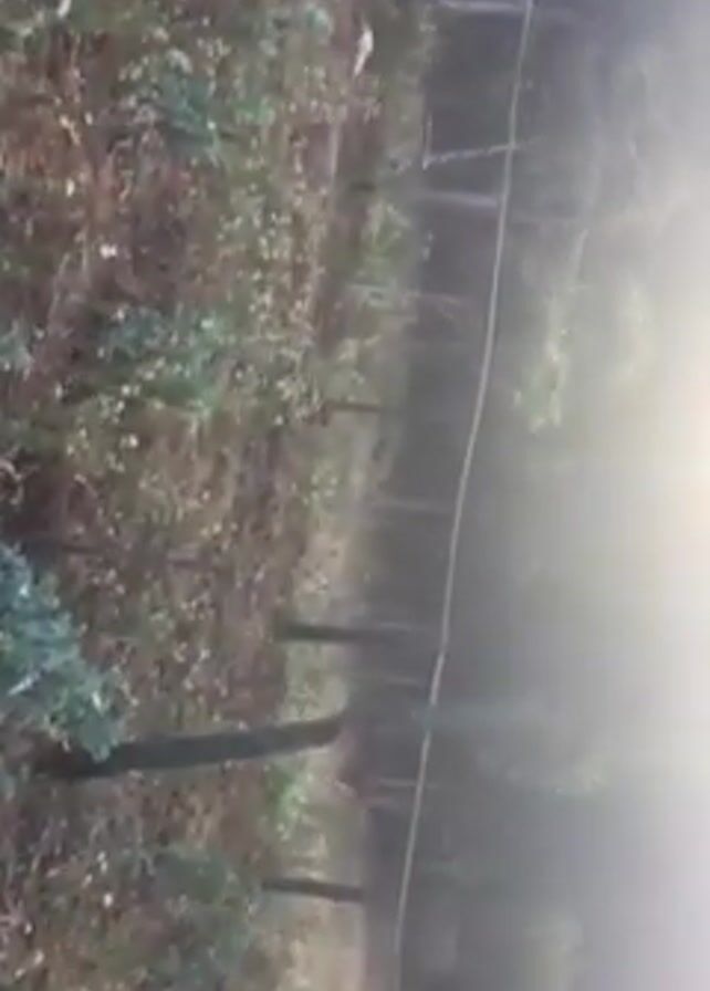The camera pans slowly across a fenced field with small plants growing in rows