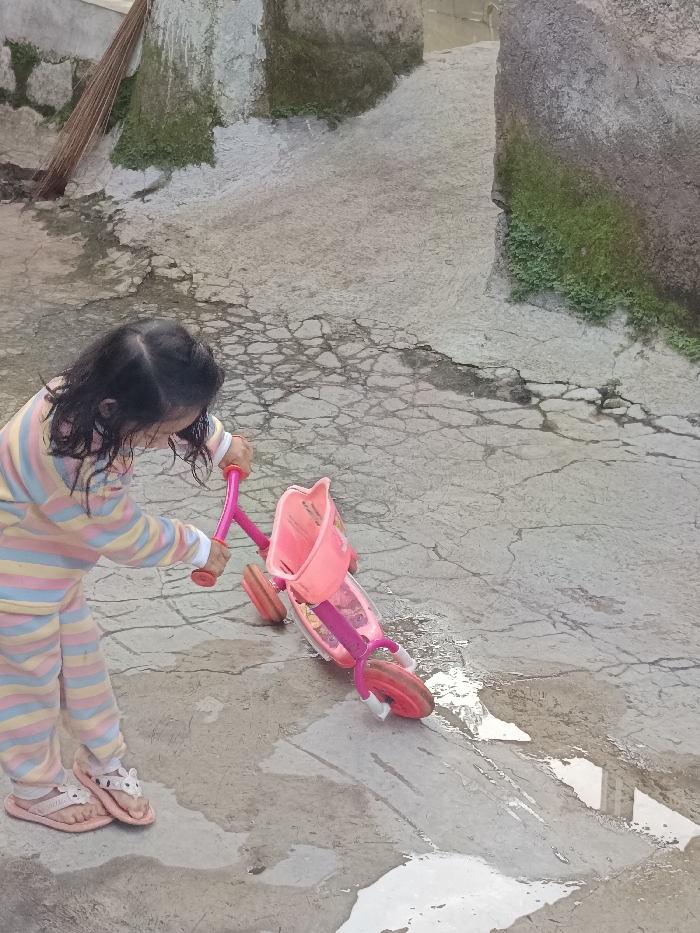 - "A young child in striped pajamas and sandals stands on a cracked, concrete surface, pushing a pink tricycle" by FM-WRTkH2, licensed under CC BY 4.0
