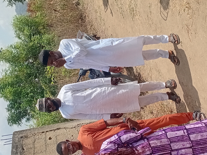 Three men pose outdoors. The top two wear white traditional attire and sandals. One wears a black skullcap, and the other has a patterned one with a beard. The bottom man wears glasses, an orange top, and patterned fabric around his waist. They stand on a dirt surface, with vegetation and a hillside visible in the background. Part of a motorcycle is also seen.