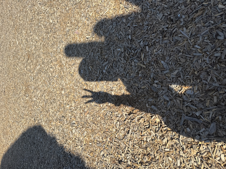 The image displays a ground covered in wood chips, partially illuminated by sunlight. Shadows cast by people and objects are visible. One shadow appears to be a person's head with a hand making a peace sign. Another shadow is a simple angular shape, likely a piece of playground equipment. The sunlight angle suggests an early morning or late afternoon time.