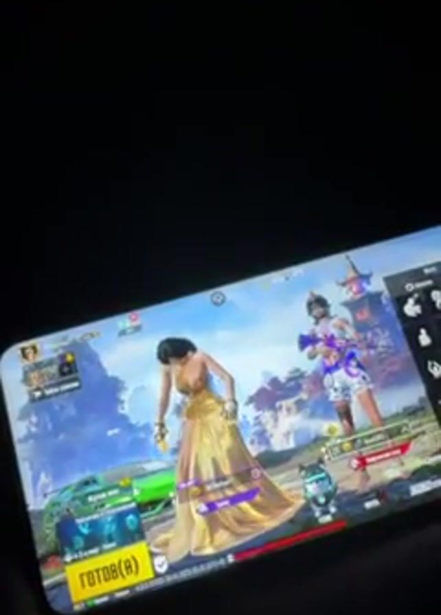 A handheld shot shows a mobile phone displaying the home screen of the PUBG Mobile video game. A female character in a gold dress stands beside a character with a gun in swim trunks. A car and a wolf-like pet are also visible on the screen. The phone is held in a dark environment with little ambient light.