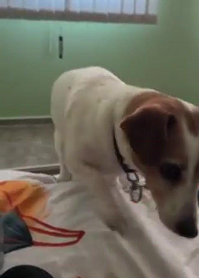 A medium shot shows a brown and white Jack Russell terrier standing on a bed