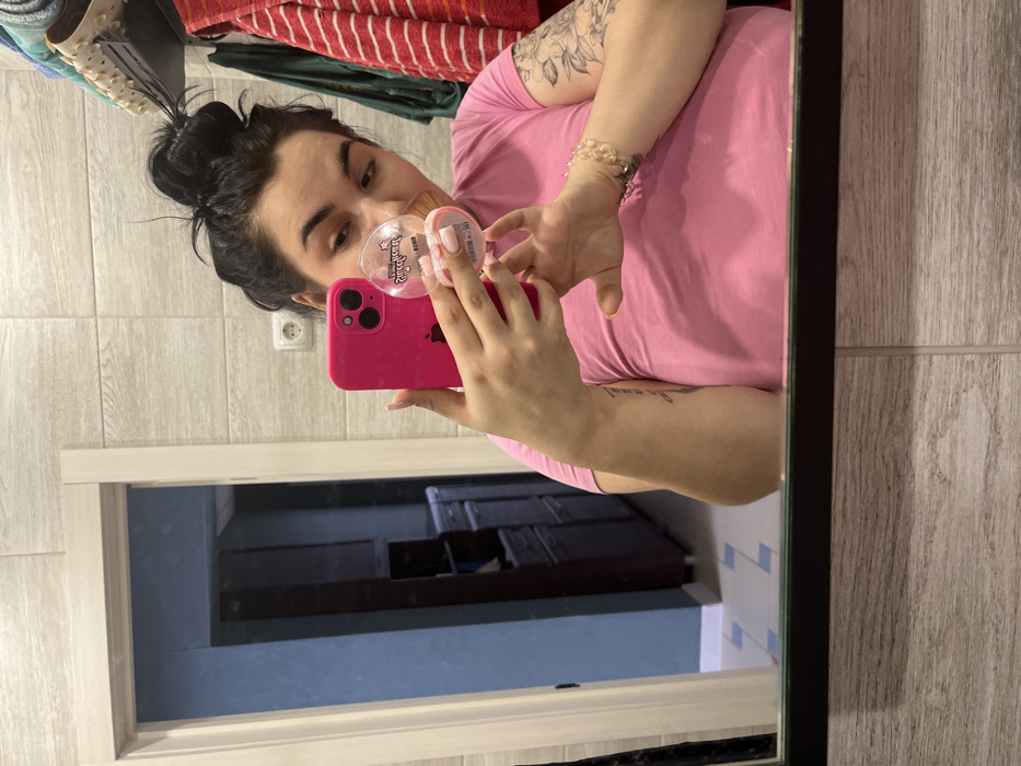 An individual is captured in a mirror selfie within an indoor setting, presumably a bathroom, in the city of Chaikovsky, Russia. The central figure is a female with dark hair styled in a messy bun, wearing a pink t-shirt. She has script tattoos on her left forearm and floral tattoos on her upper right arm. A light-colored beaded bracelet is visible on her right wrist, and her fingernails are painted a light shade. She holds a pink-cased smartphone, appearing to be an iPhone, in her left hand, directed towards the mirror to take the photograph. In her right hand, she holds a clear, round cosmetic compact with a pink base, containing a small beige applicator sponge. The compact's label is partially visible, displaying "Sweet Heart" and "DEWY BOMB." The individual is positioned with the sponge near her nose, looking towards her reflection. The background shows light-colored, wood-grain patterned rectangular tiles covering the walls. A white electrical outlet is visible on the wall behind her head. To the left, a white-framed doorway opens into an adjacent room with blue walls, dark wooden cabinetry, and a tiled floor featuring a light and dark rectangular pattern. To the right, a red and white striped towel, a dark green garment, and a light-colored textured item, possibly a shower mat, hang on hooks or a rack. The bottom edge of the mirror has a black frame, below which the same wood-grain patterned wall tiles are visible.