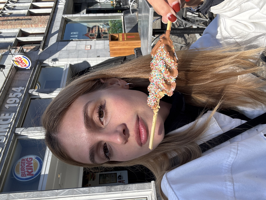 A young adult female with light brown hair and a fair complexion is depicted in a medium close-up, directly facing the camera. She is wearing a white denim jacket over a dark garment. Her left hand, featuring fingernails painted dark red, holds a wooden skewer with a partially consumed, chocolate-dipped waffle covered in multicolored sprinkles; a bite has been taken from the waffle. The background reveals the stone facade of a commercial building on a sunny day. Prominently displayed are multiple Burger King logos and a sign above the windows indicating "SINCE 1954". Outdoor seating, consisting of metal tables and chairs, is visible outside the establishment. This Burger King is located at Steenstraat 11 in Bruges, Belgium. A reflection in a distant window shows a building with a red roof.